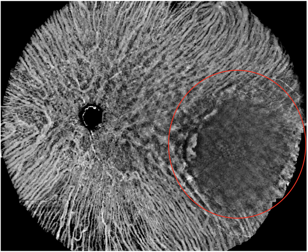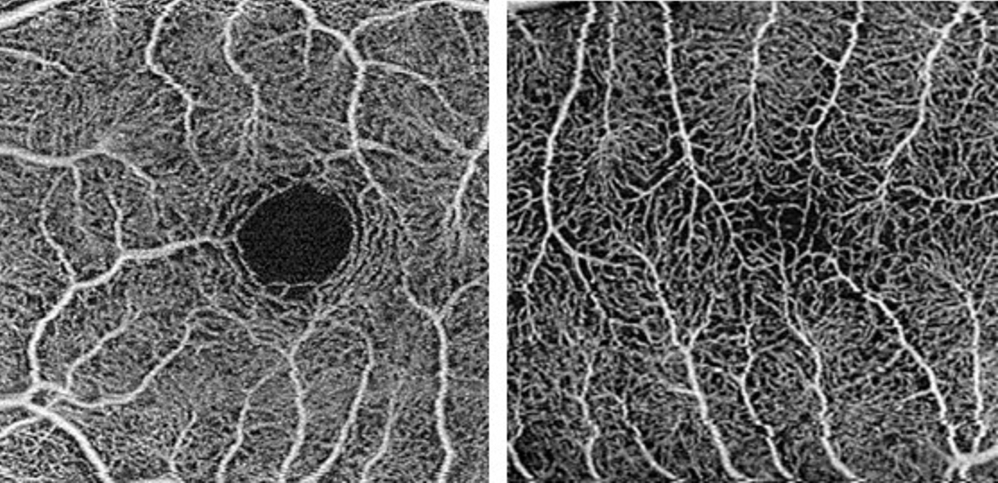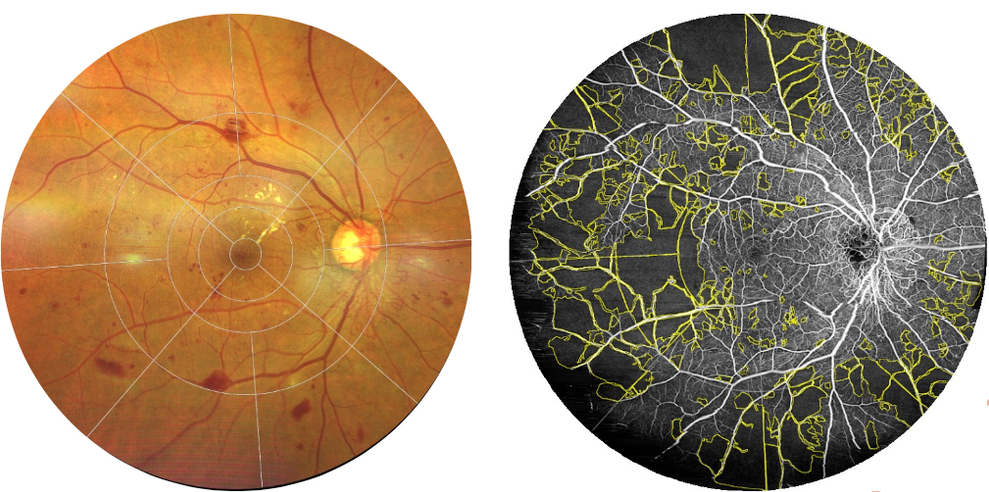 Abbildung 4: Farbfotographie (links) & OCTA (rechts) desselben Patienten