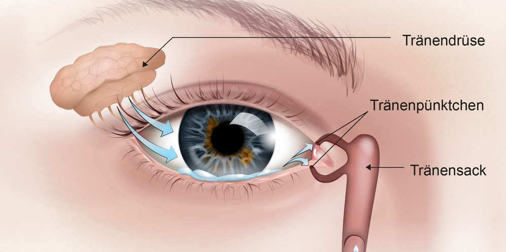 Abbildung 2: Abfluss der Tränenflüssigkeit über Punktum, Kanälchen und Tränensack in die Nase