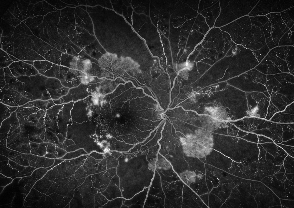 Abbildung 1: Patient mit proliferativer DR, multiplen Proliferationen & Minderperfusion