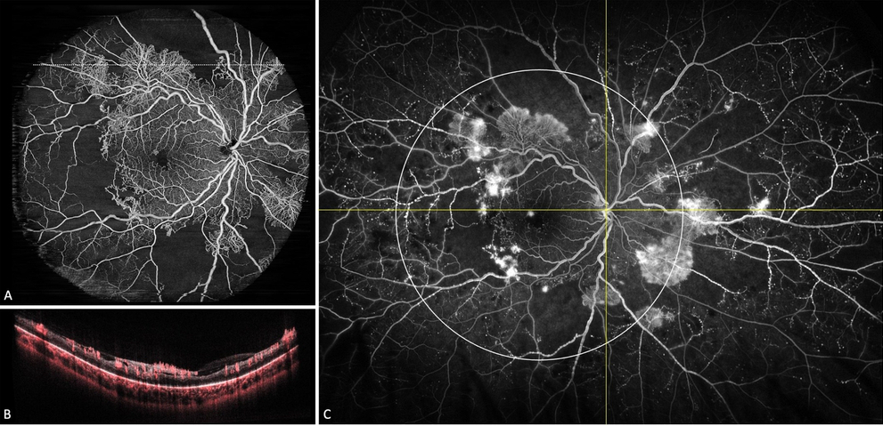 Abbildung 2: Patient mit proliferativer DR, OCTA (A) mit B-Scan (b) und FLA (C)