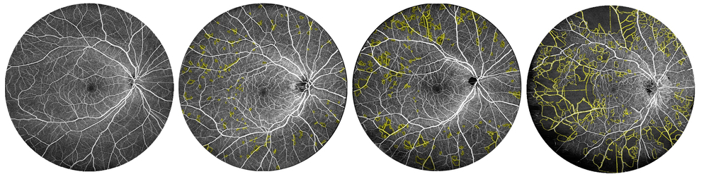 Abbildung 3: Nicht-durchblutete Areale (gelb) in zunehmenden DR Stadien (von links nach rechts)