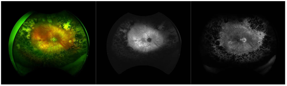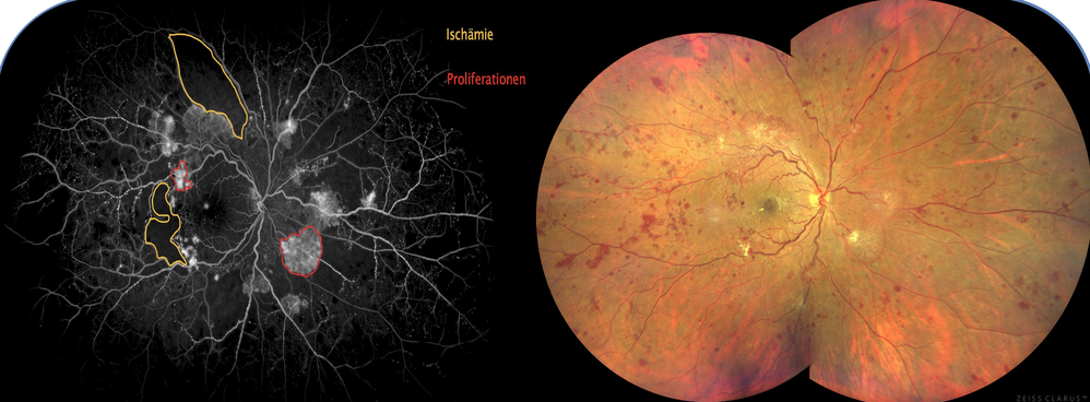 Abbildung 3: Floureszenz-Angiographie (links) und Fundusfotographie (rechts) eines Auges